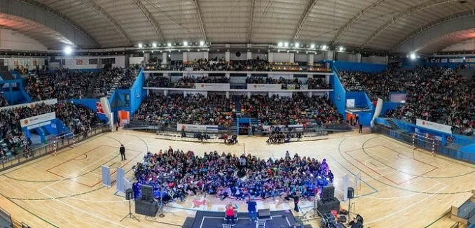 Durante la capacitación, los docentes no sólo escucharon y tomaron nota, sino que también cantaron y bailaron en las tribunas y la cancha del estadio Aldo Cantoni. Participaron docentes de Educación Inicial y Primaria, de Educación Especial, profesores de Especialidades, de Educación Física, Música y Artes Visuales, tanto de gestión estatal como privada.