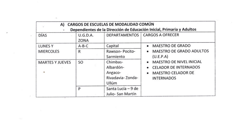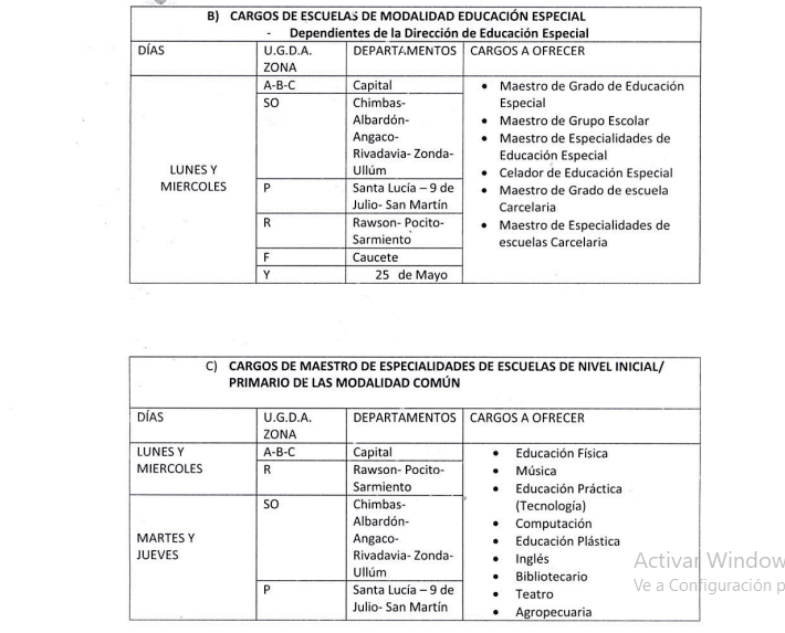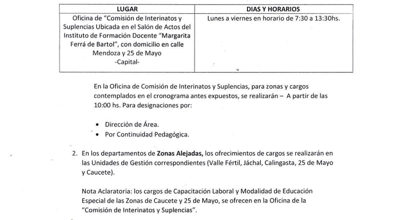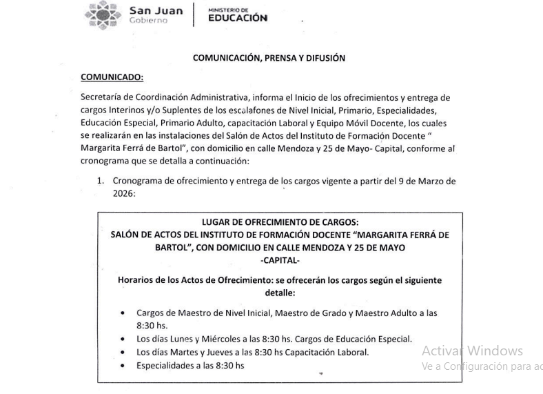 Secretaria de Coordinación Administrativa del Ministerio de Educación de San Juan informa el inicio de los ofrecimientos y entrega de cargos interinos y/o suplentes de los escalafones de Nivel Inicial, Primaria, Especialidades, Educación Especial, Primario Adulto, Capacitación Laboral y Equipo Móvil Docente.
