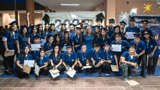 El Ministerio de Educación cerró formalmente el ciclo lectivo 2025 con el acto de egresados de la escuela de Comercio Sixto Salinas de Rivera, ubicada en la localidad de Carpintería, departamento Sarmiento. La actividad fue encabezada por la ministra de Educación, Silvia Fuentes, quien eligió compartir este momento junto a la comunidad educativa como gesto simbólico de cierre del año escolar.