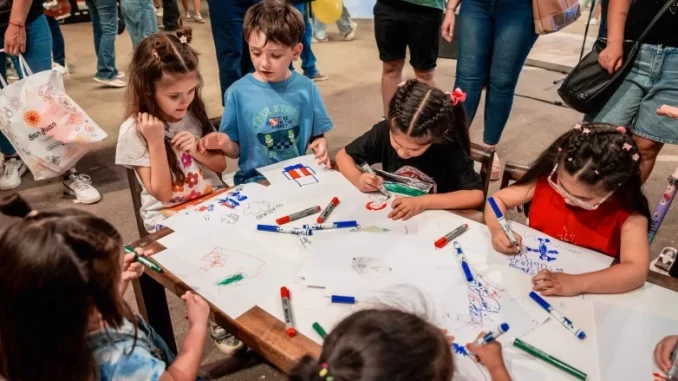 En la FNS, Educación ofreció espacios de participación permanente como el Memotest, el juego Veo Veo sobre un muro ilustrado donde los niños buscaron objetos escondidos, las trivias en pantallas con preguntas y premios, y la pizarra de recuerdos escolares, que reunió centenares de mensajes sobre la experiencia de haber sido alumno.
