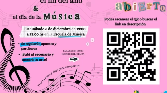 La invitación es para festejar el fin de este ciclo lectivo y el Día de la Música. Será este sábado 6 de diciembre de 19:00 a 23:00 en la Escuela de Música.