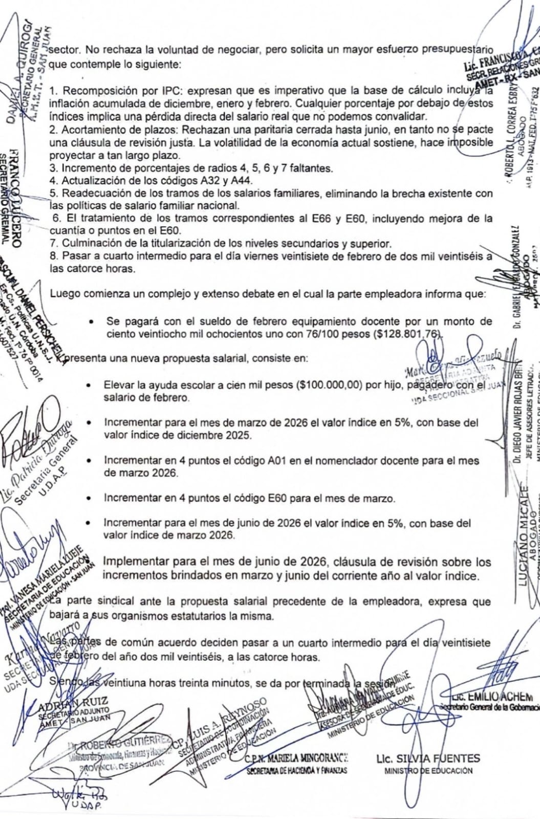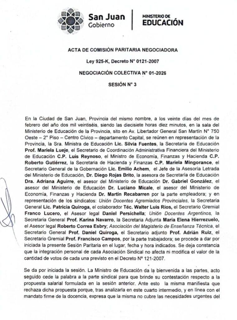 En el marco de la negociación paritaria docente, el Gobierno de San Juan presentó el pasado viernes 20 de febrero una nueva propuesta salarial que incluye aumentos escalonados del 10% al valor índice durante el primer semestre del año, mejoras en ítems del nomenclador y pagos extraordinarios a liquidarse con los haberes de febrero.